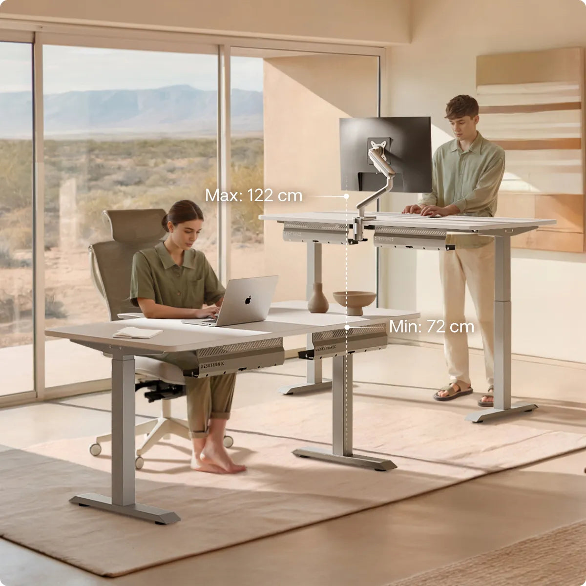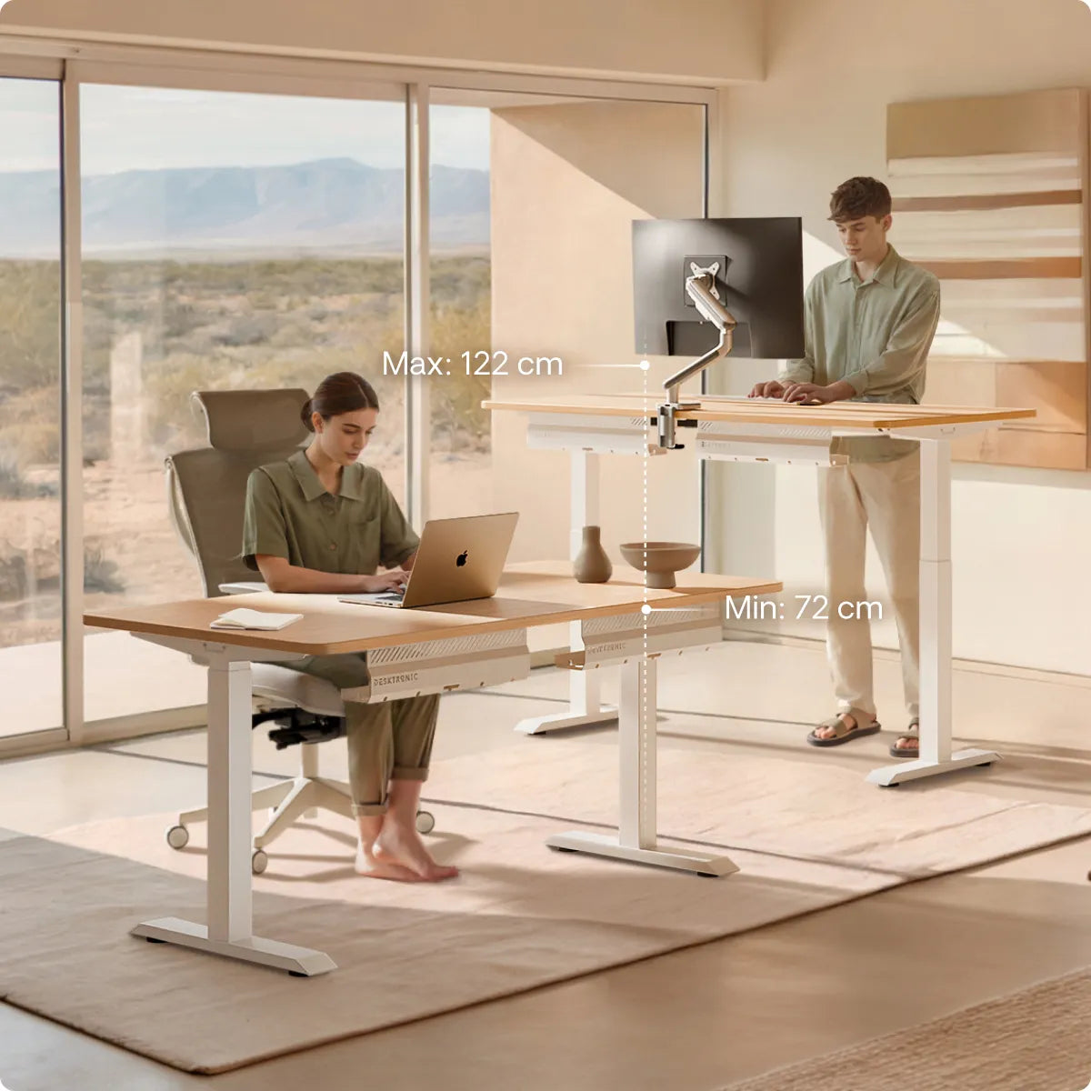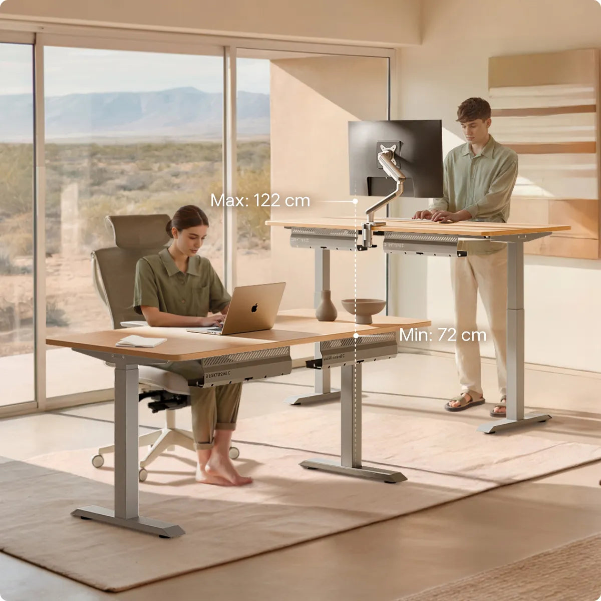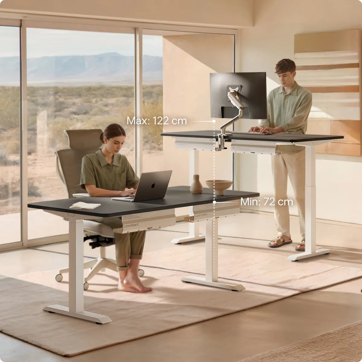 Desktronic hæve-/sænkeborde byder på praktiske justeringsmuligheder. Disse skriveborde, som er udstyret med en elektronsik touch-skærmsbetjening, viser højden i centimeter, så du nemt kan hæve eller sænke dem med den indbyggede motor. Derudover har de tre fuldt programmerbare højdeindstillinger, så du kan opnå din foretrukne skrivebordsindstilling med et enkelt klik.
