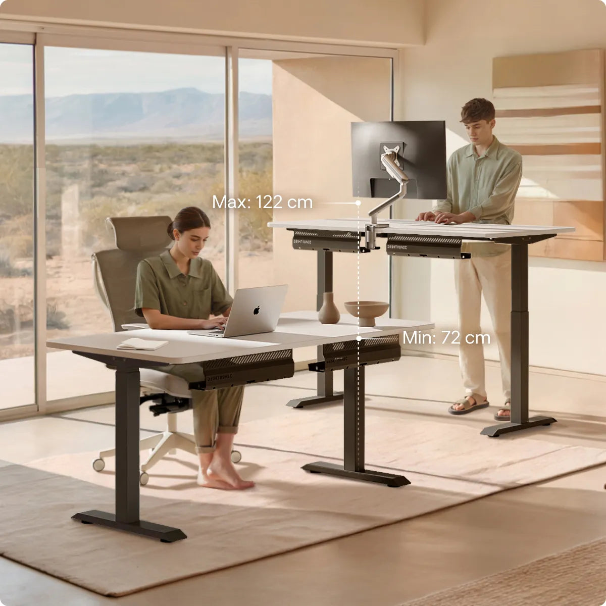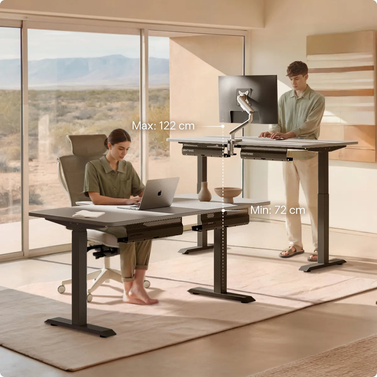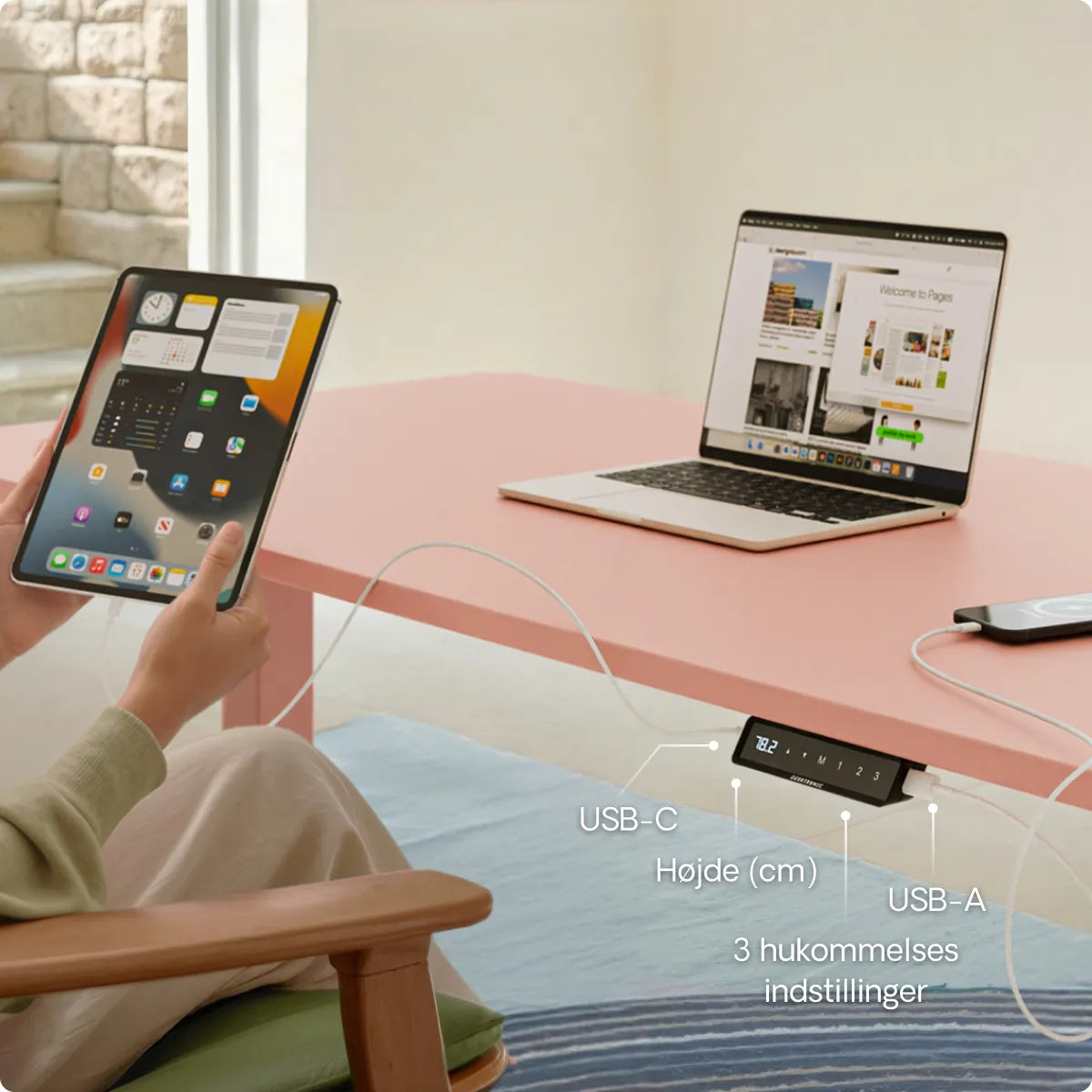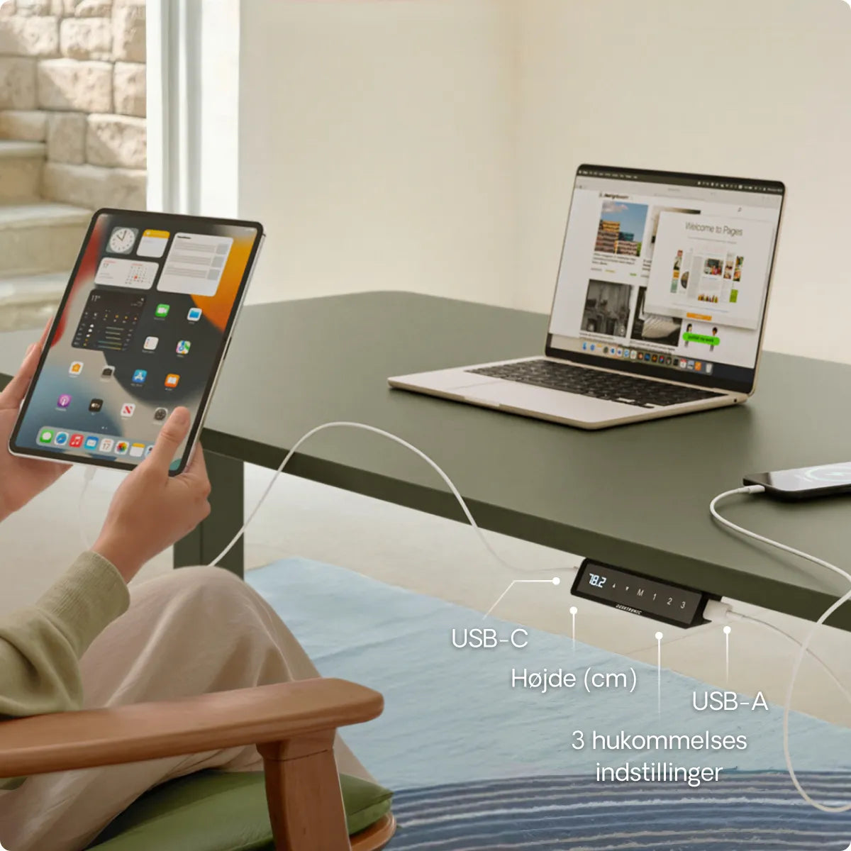 e takket være dens førsteklasses materialer, design og elektronik. Markedsførende dobbelt-motorsystemer skaber hurtige, problemfrie og lydløse overgange. Anerkendt for sin særligt forstærkede stålramme, som gør dette skrivebord ekstremt stabilt og sikrer en pålidelig arbejdsoverflade under dine mest intense arbejdstimer. Det moderne kontrolpanel, som er let tilgængeligt, kan bruges til at indstille din foretrukne skrivebordshøjde med et enkelt klik, og den har 3 hukommelsesindstillinger. Integrerede USB/USB-C porte holder dine vigtigste ting på sin plads - og sikrer at dine enheder altid er inden for rækkevidde. Leveres med en forboret bordplade i ét stykke efter dit eget valg. Værktøj er inkluderet.