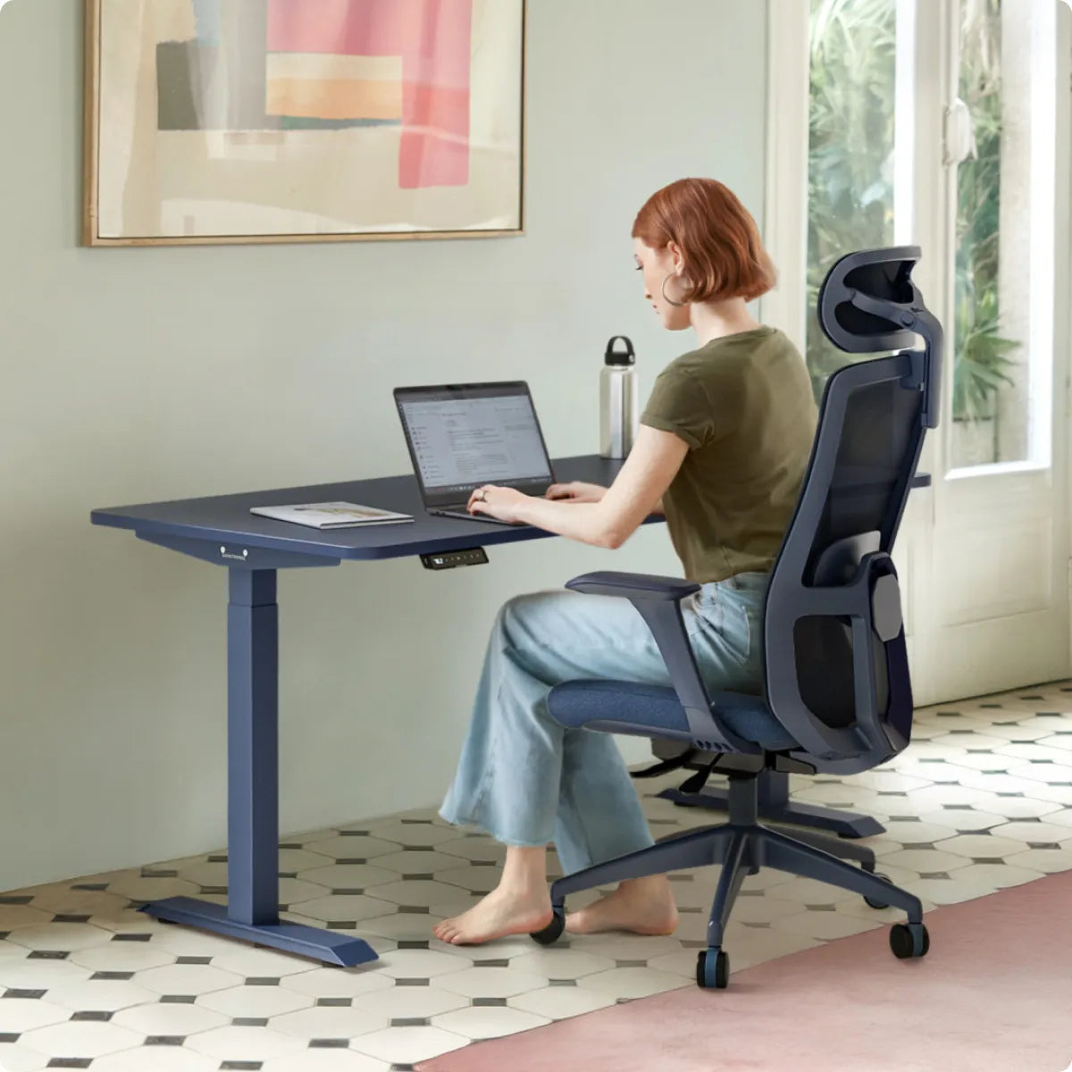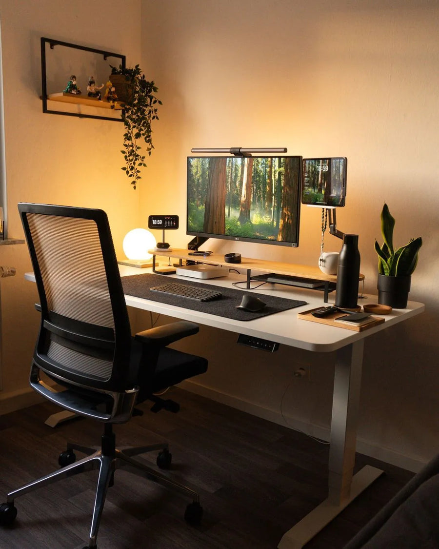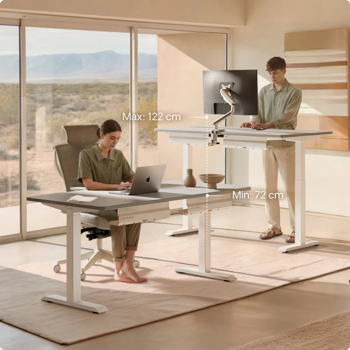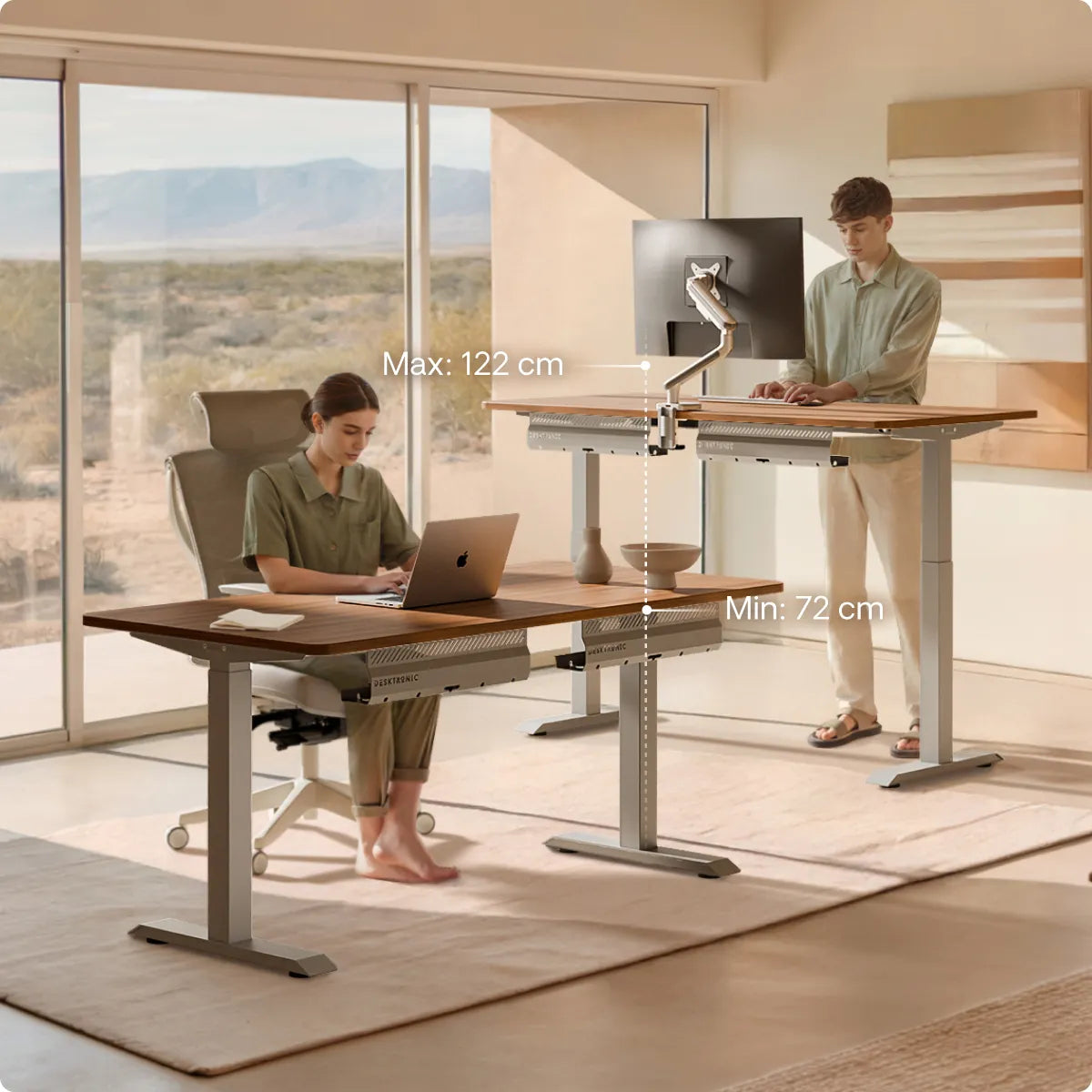 Den ideelle skrivebordshøjde varierer fra person til person, men en generel tommelfingerregel er, at dit skrivebord bør være i albuehøjde, når du sidder ned, og toppen af din skærm bør være i øjenniveau for at undgå spændinger. Når du står op, bør dit skrivebord være på linje med dine bøjede albuer.