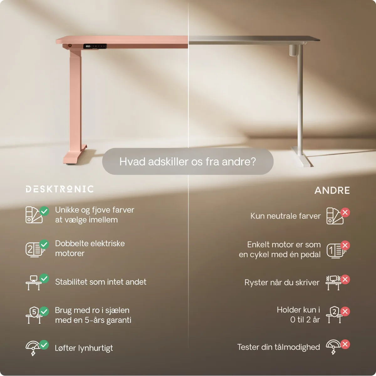Alle vores skriveborde er dækket af en udvidet 5-årig garanti, og vi er stolte af at tilbyde omfattende dækning uden nogle komponent-specifikke begrænsninger. I det sjældne tilfælde at der skulle være et problem med dit skrivebord, som kan løses med en reservedel, kan du vide dig sikker på, at vi med det samme vil afsende den nødvendige del. Hvis problemet f.eks. er relateret til stellet, sender vi dig et helt nyt og arrangerer problemfri returnering af det gamle stel. For at igangsætte denne proces skal du helt enkelt tage et billede eller video af den defekte del eller skaden og kontakte vores kundeserviceteam. Vi prioriterer kundetilfredshed, og i de fleste tilfælde vil vi sende reservedelen eller stellet til dig den næstkommende hverdag.
