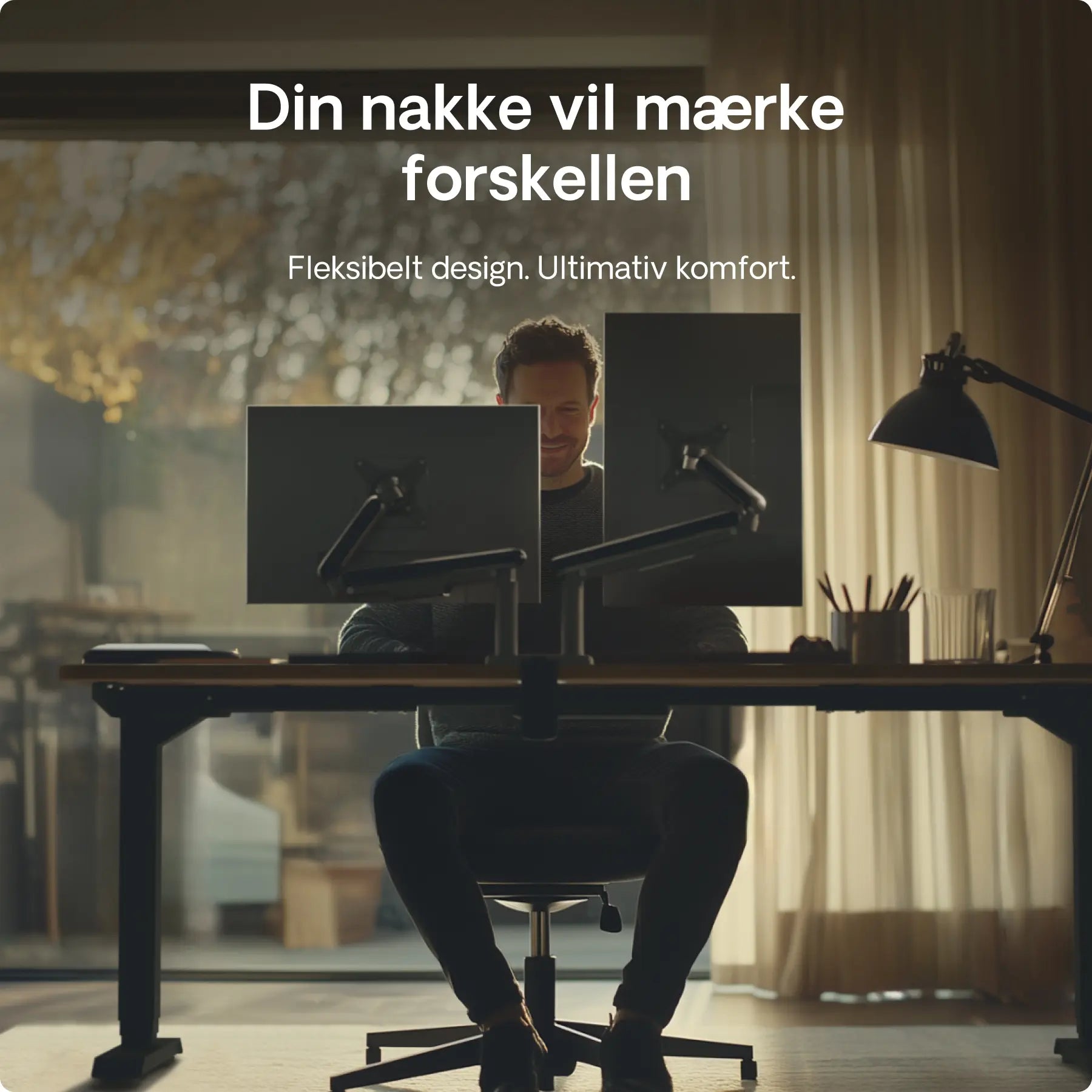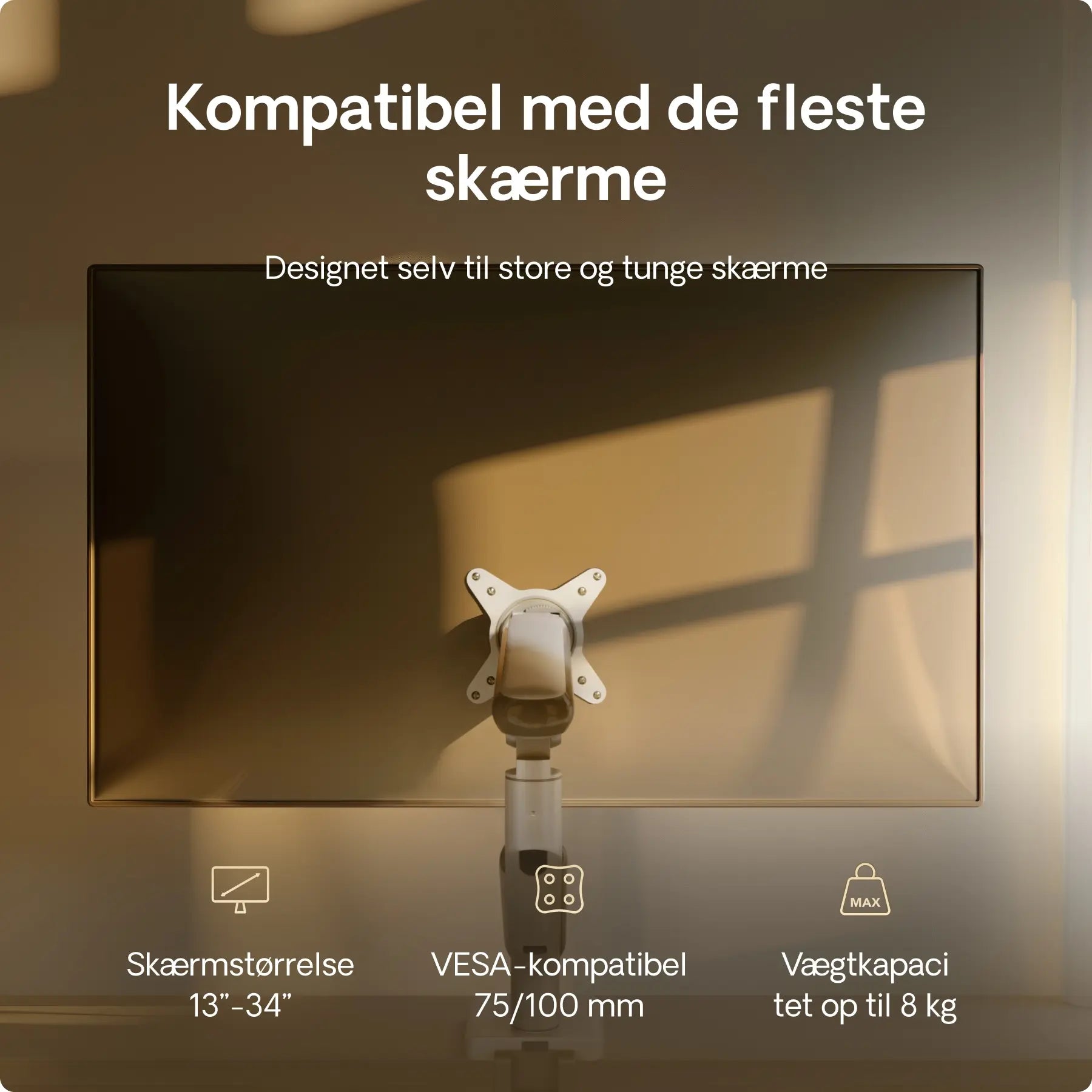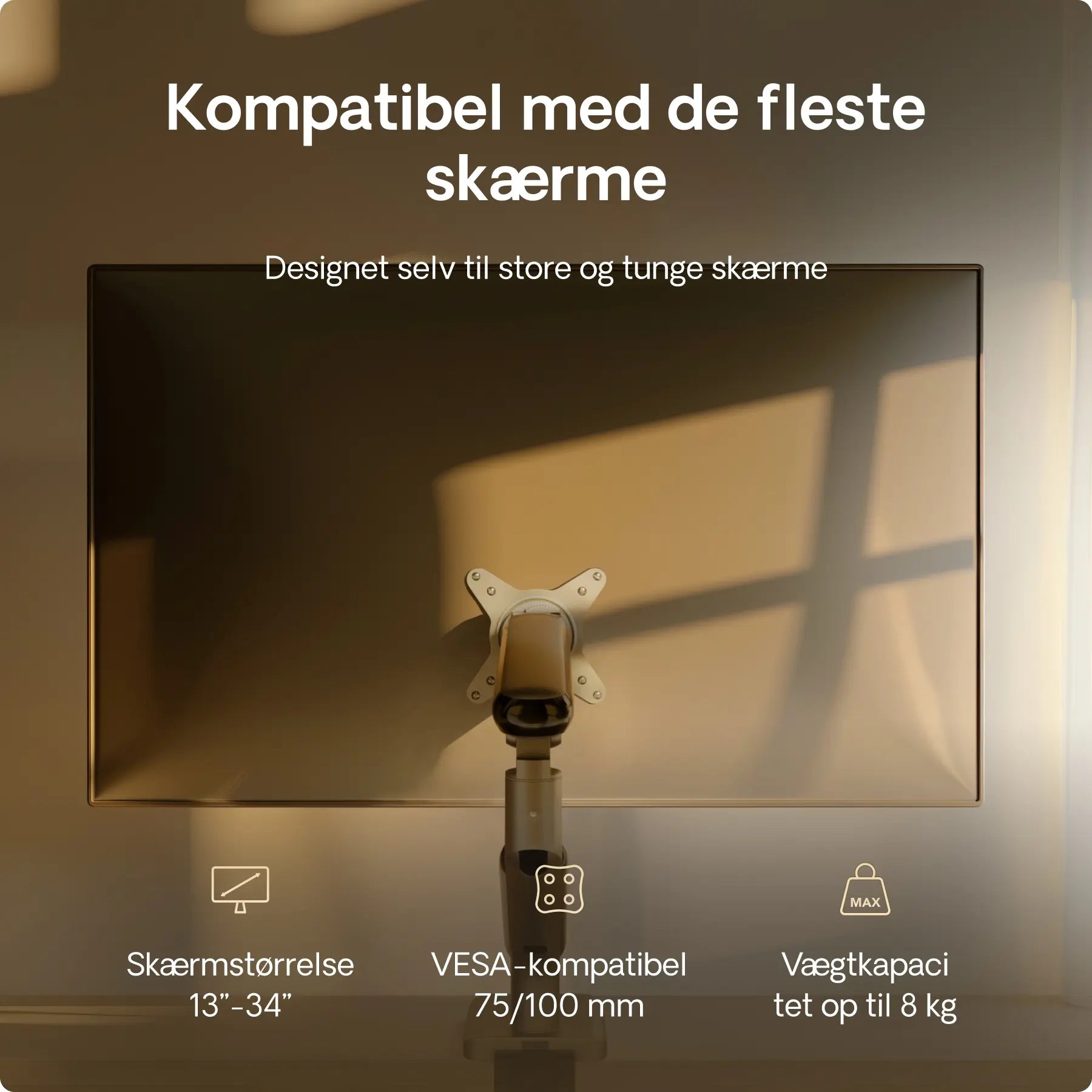 Vores skærmarme er kompatible med en lang række skærme, så du problemfrit kan montere næsten enhver skærm uden at bekymre begrænsninger i hverken størrelse eller mærke. Det er et af de stærkeste, letteste og mest alsidige skærmbeslag på markedet.