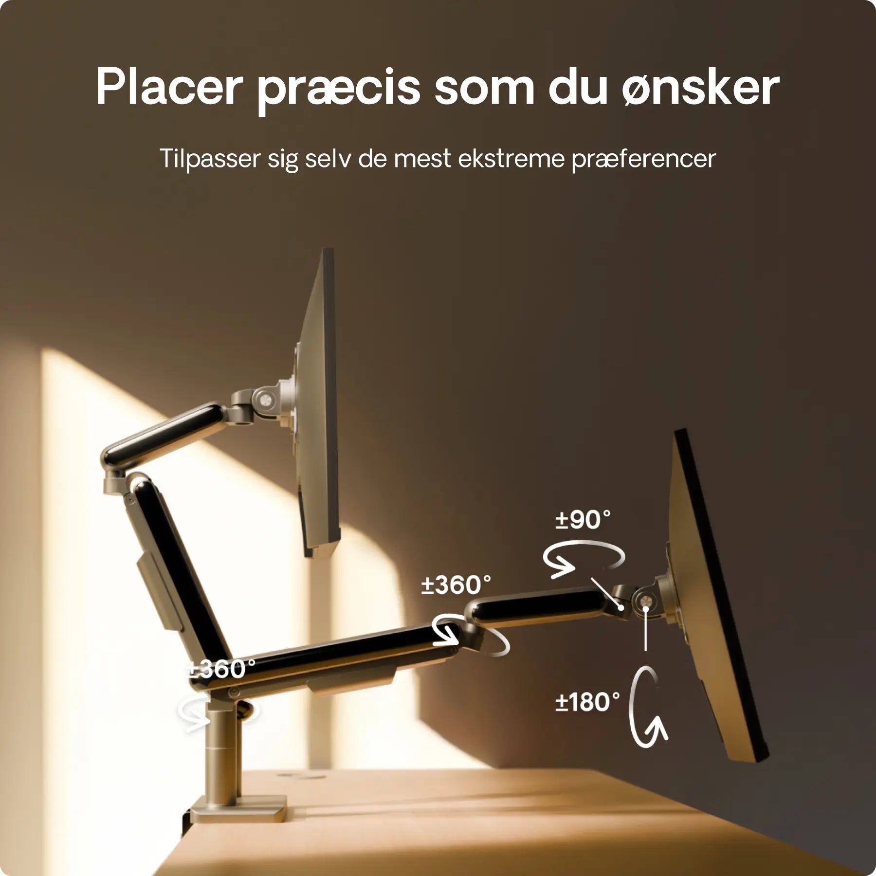Vores metal monitor holdere har en bred bevægelsesgrad, der sikrer optimal visningskomfort. De tilbyder fuld 360° rotation, så du nemt kan skifte mellem landskabs- og portrættilstande. De justerbare arme giver generøse mulighed for at vippe, så du kan finde den perfekte vinkel til at reducere nakke belastningen.