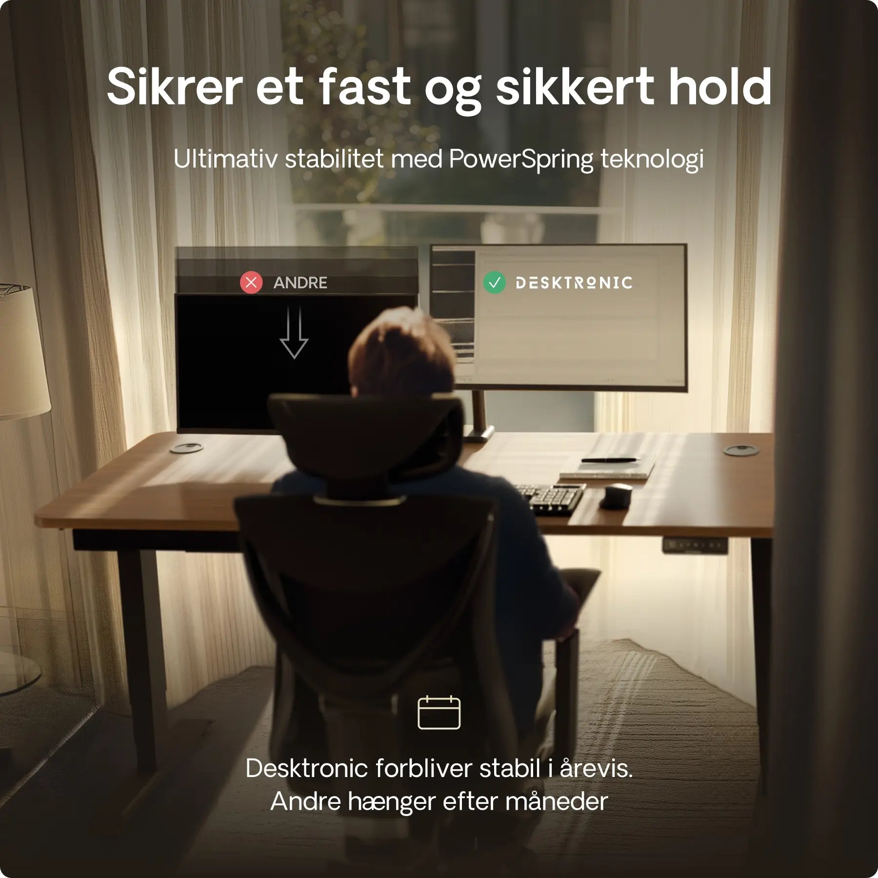 HomePro forbliver med sine stærke metalben og yderligere forstærkede ramme stabil i enhver højde og med enhver bordpladestørrelse, uden at du behøver bekymre dig om din rystende skærm eller en fuld kaffekop.