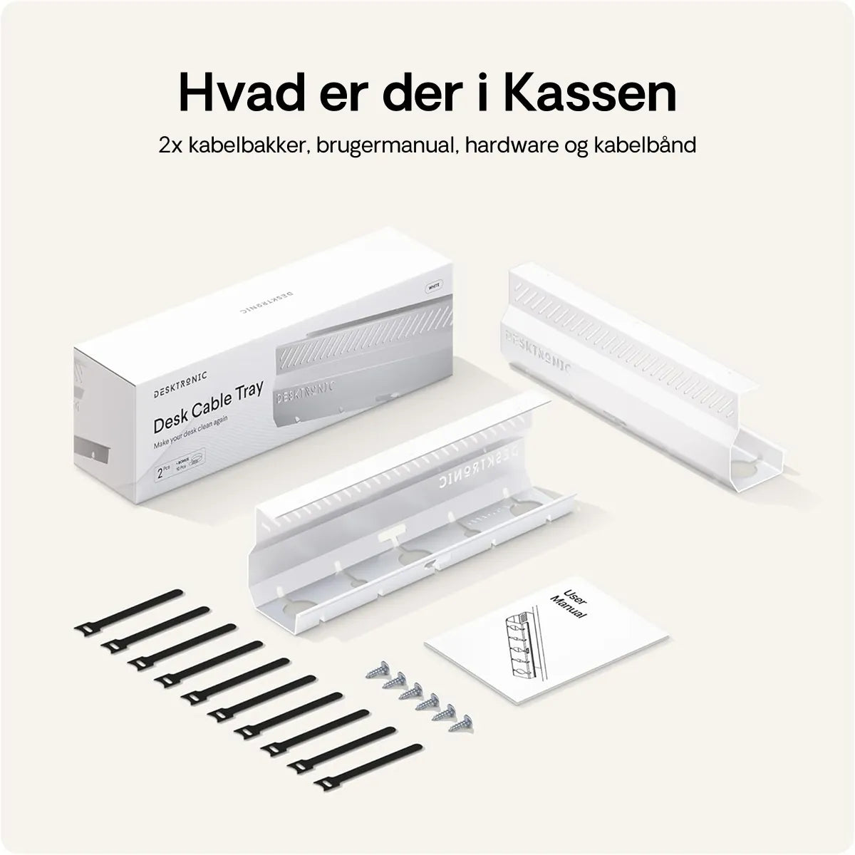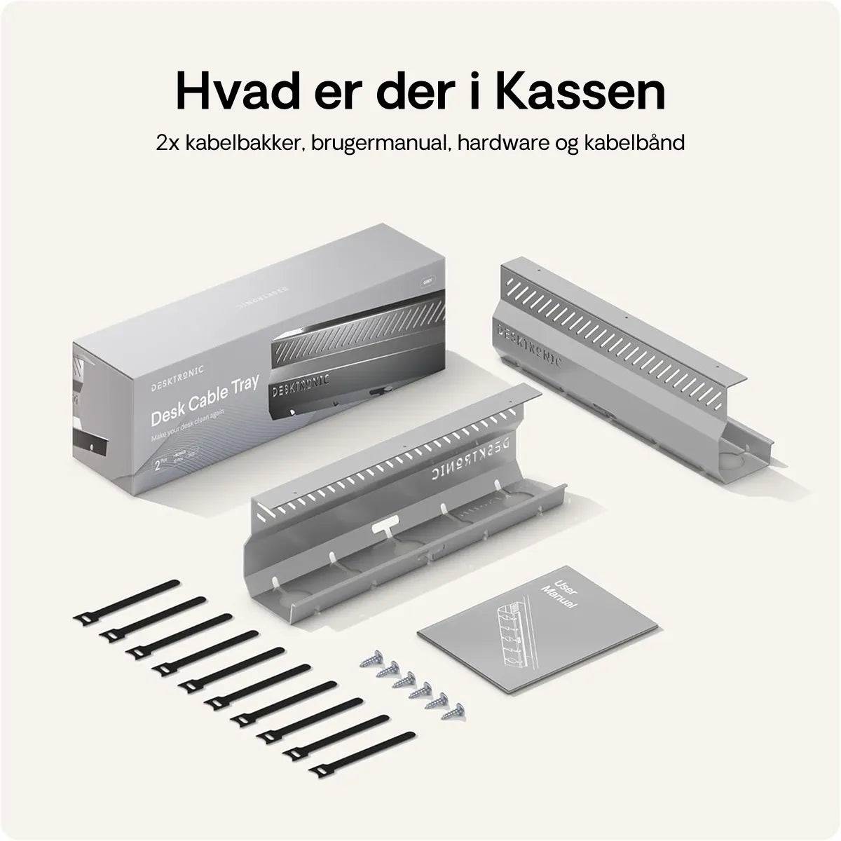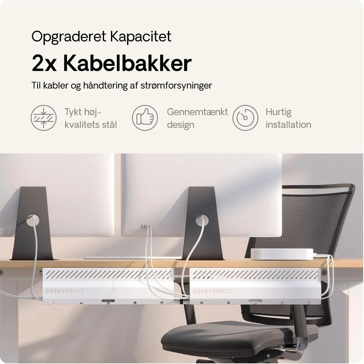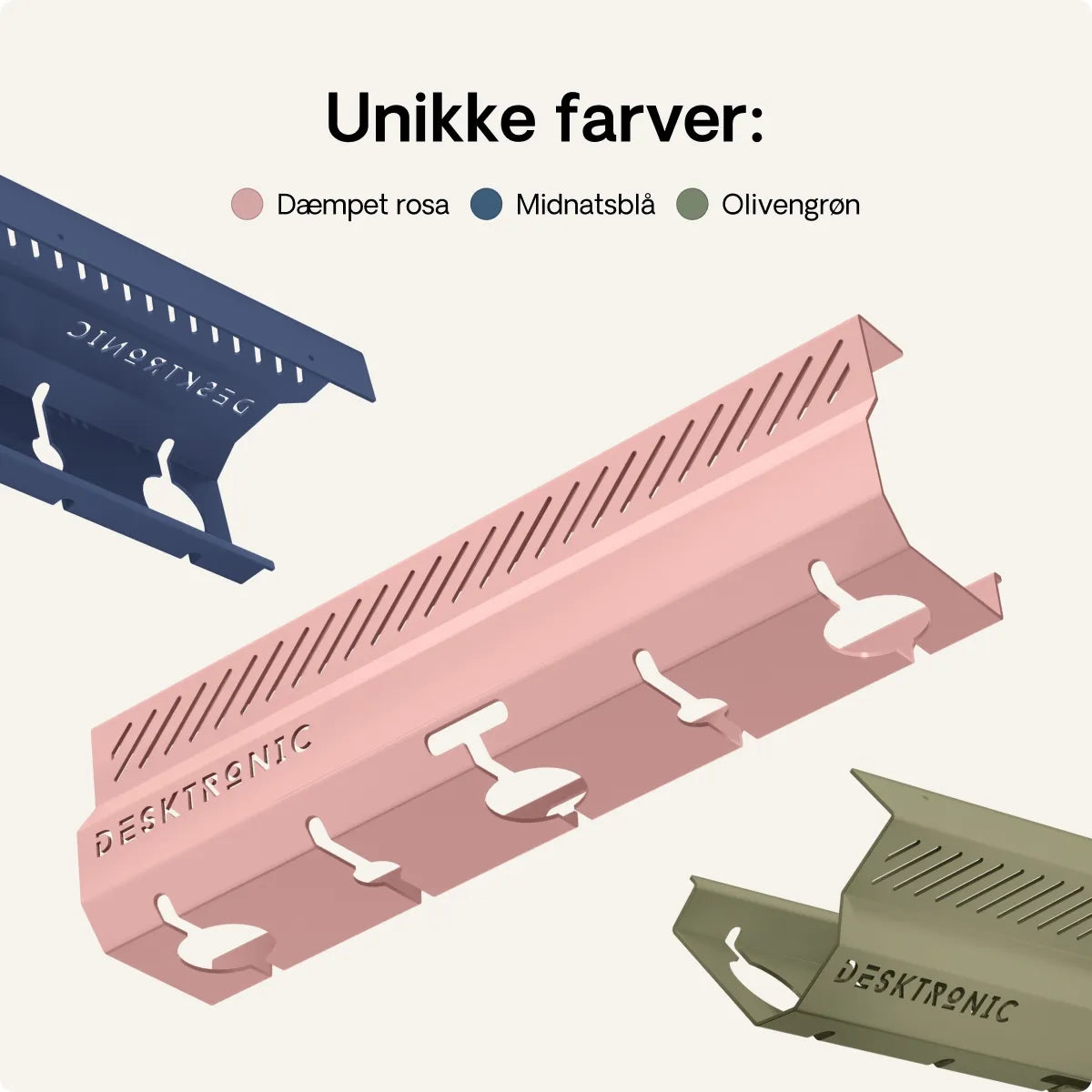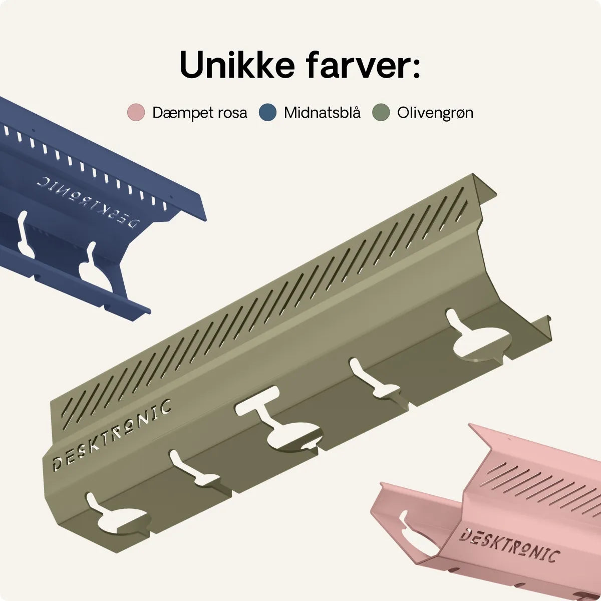 Kabelbakker tilbydes i de samme farver som vores hæve-sænke skrivebordsrammer, nemlig: Sort (RAL9005), Hvid (RAL9016) og Grå (RAL9006), for at sikre et perfekt farvematch.