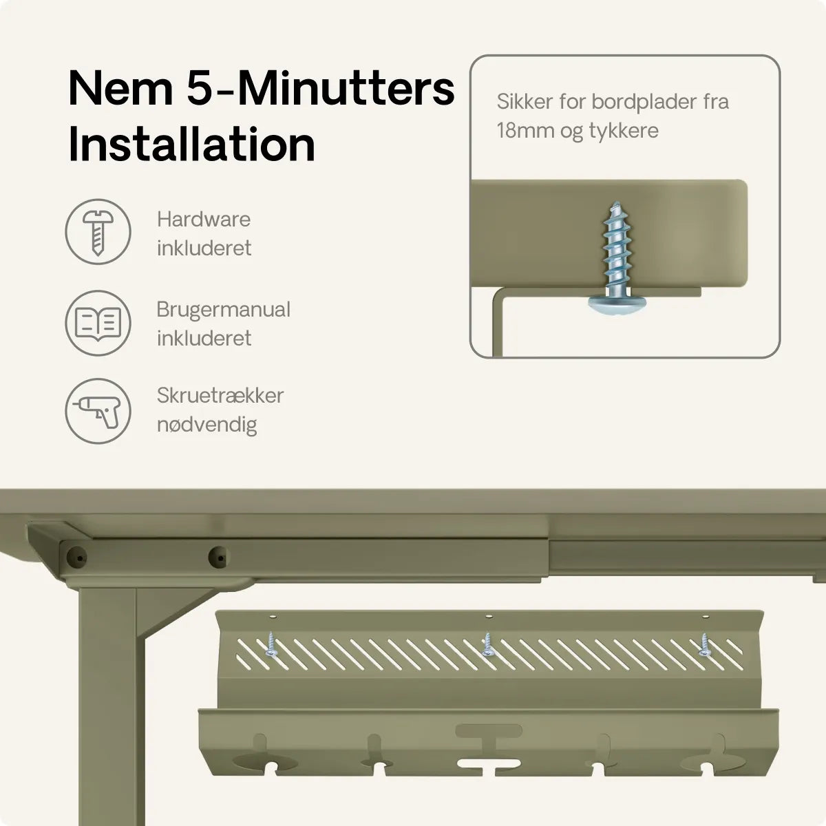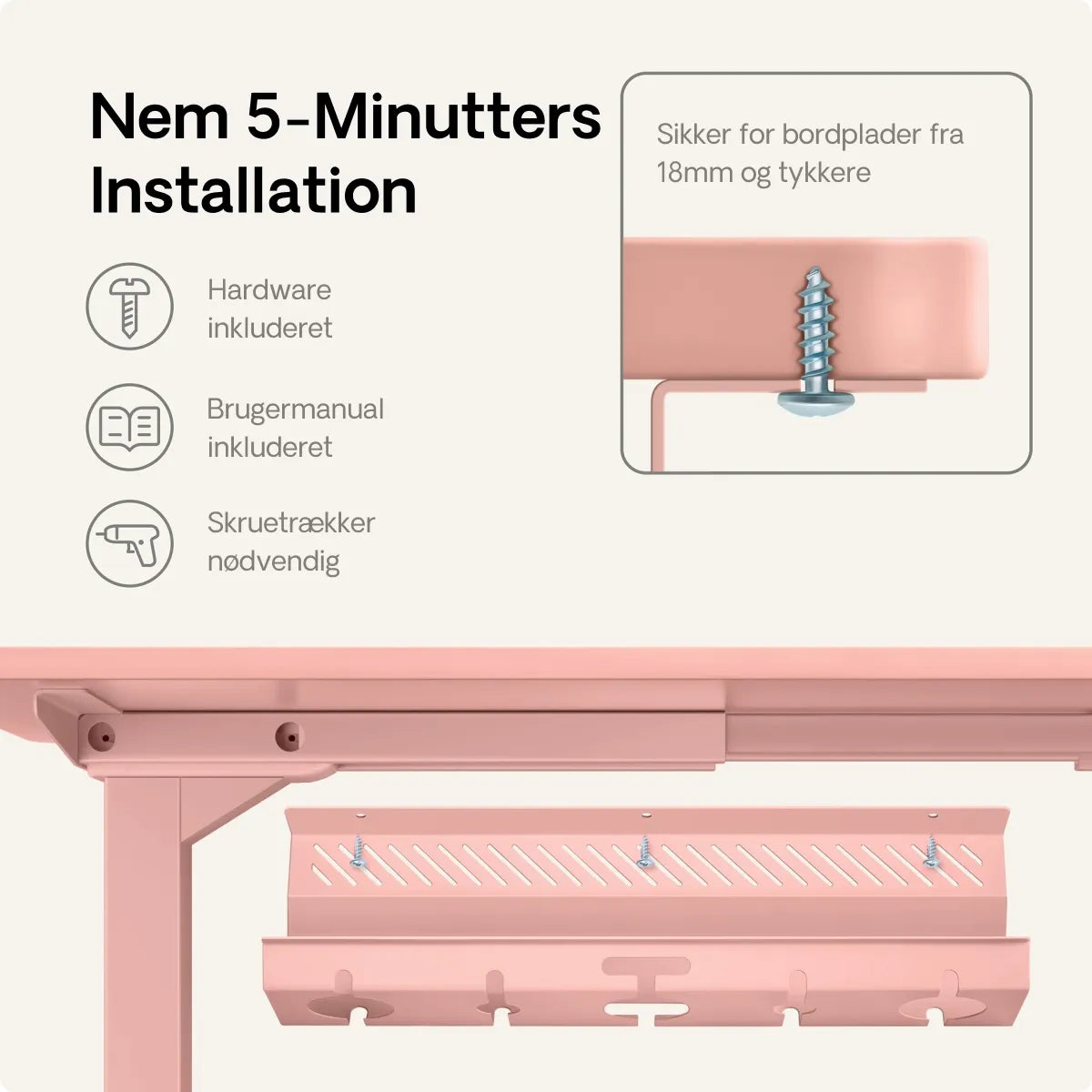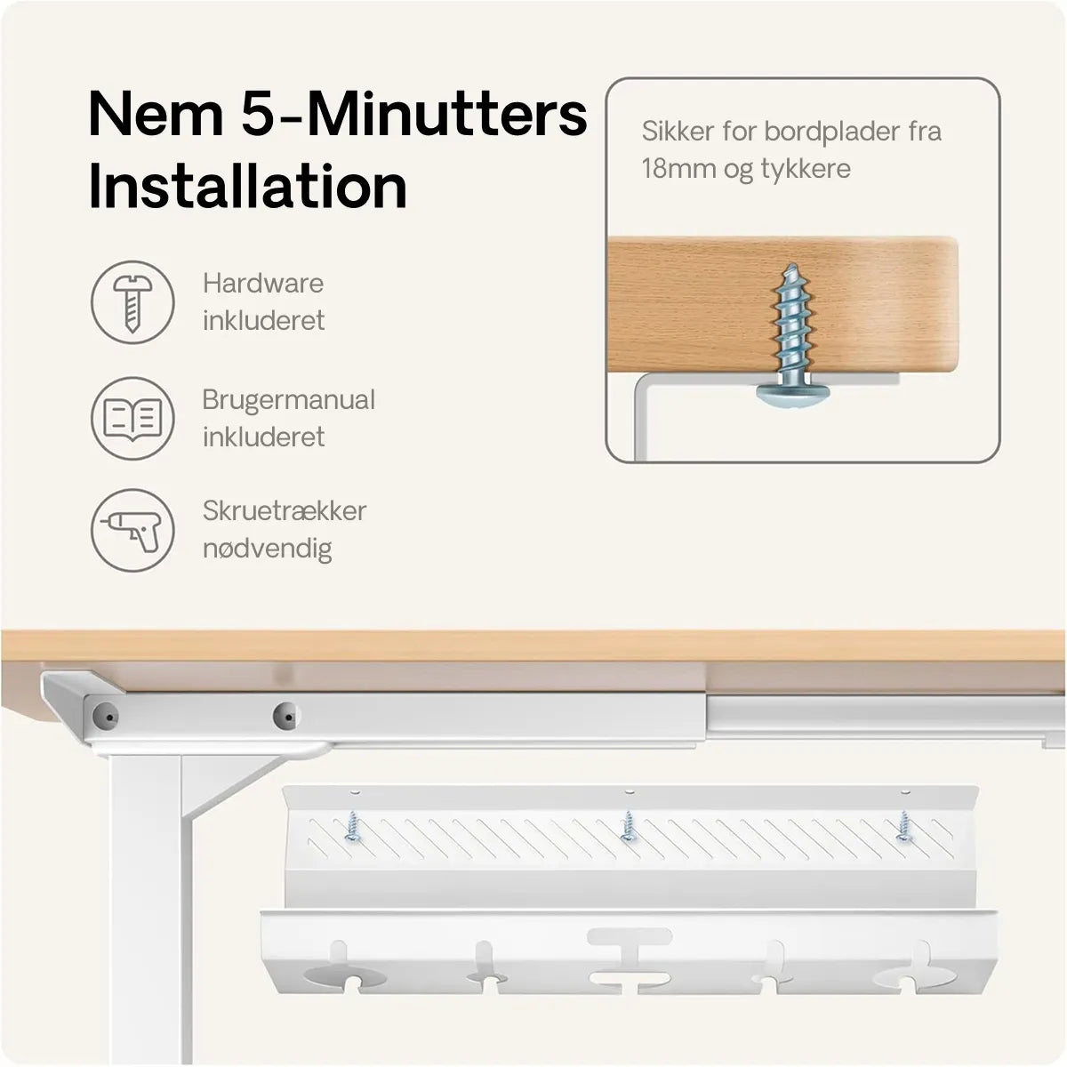 Installationsprocessen er både hurtig og ligetil. Du kan enten forbore hullerne eller bruge en elektrisk skruetrækker til at fastgøre kabelbakken til den ønskede overflade. Skruer medfølger.