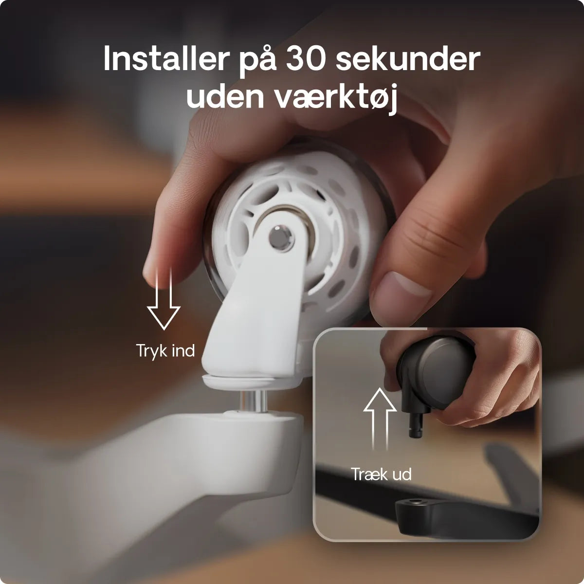 Udskiftning af dine hjul er så nemt som det kan gøres. Du skal blot fjerne de gamle og sætte dine splinternye Desktronic hjul i. En tiltrængt opgradering af din stol, der ikke kræver værktøj og tager mindre end 30 sekunder.