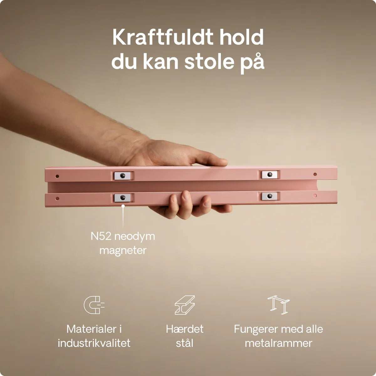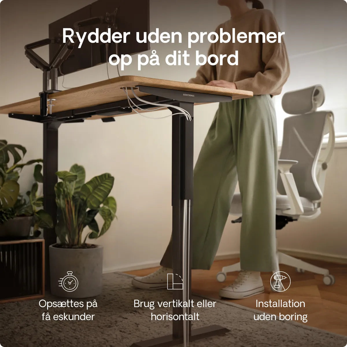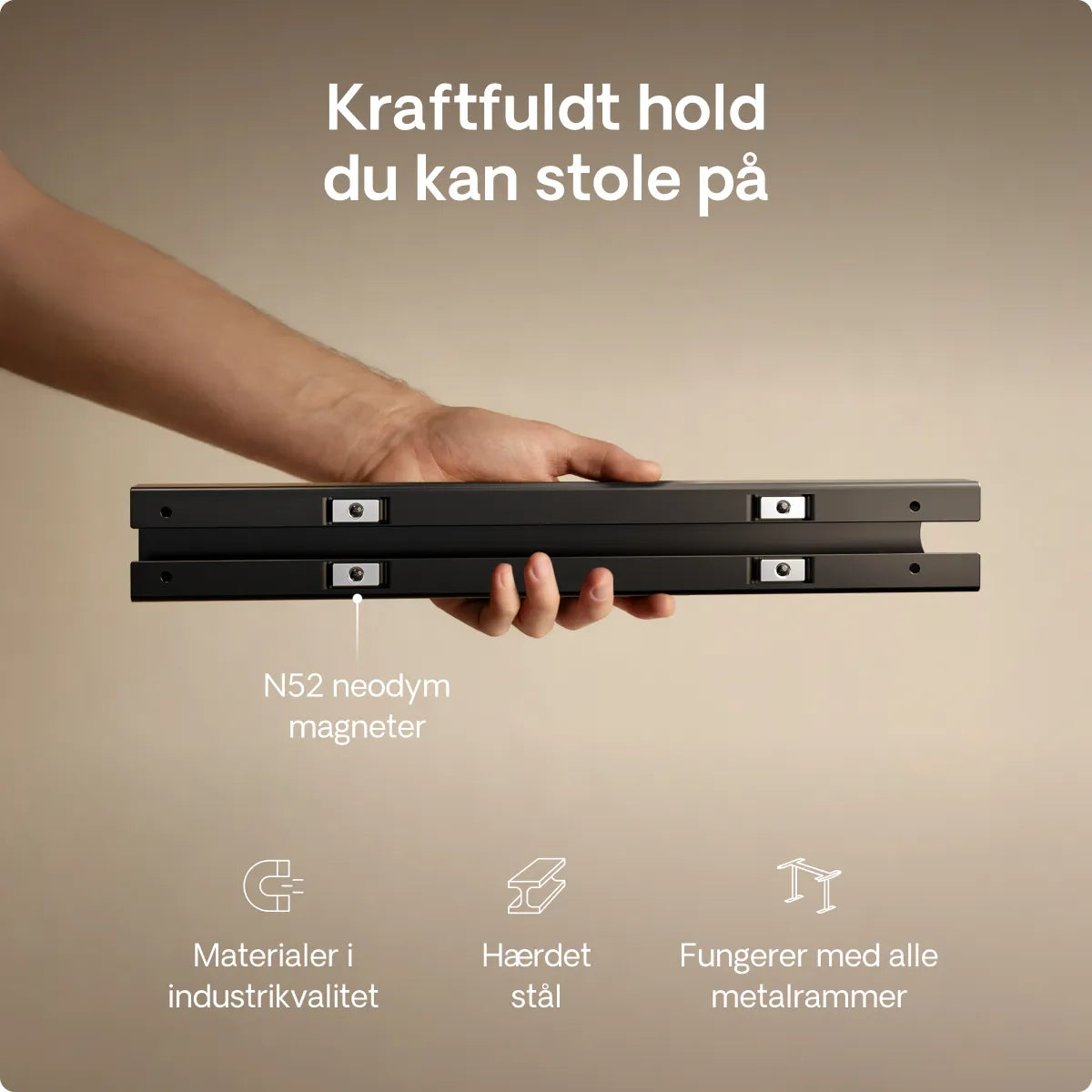 Installation er øjeblikkelig. Bare sæt den på enhver metaloverflade på din skrivebordsramme - vertikal eller horisontal. Stærke magneter holder den på plads, og du kan flytte den til enhver tid - uden brug af værktøj.