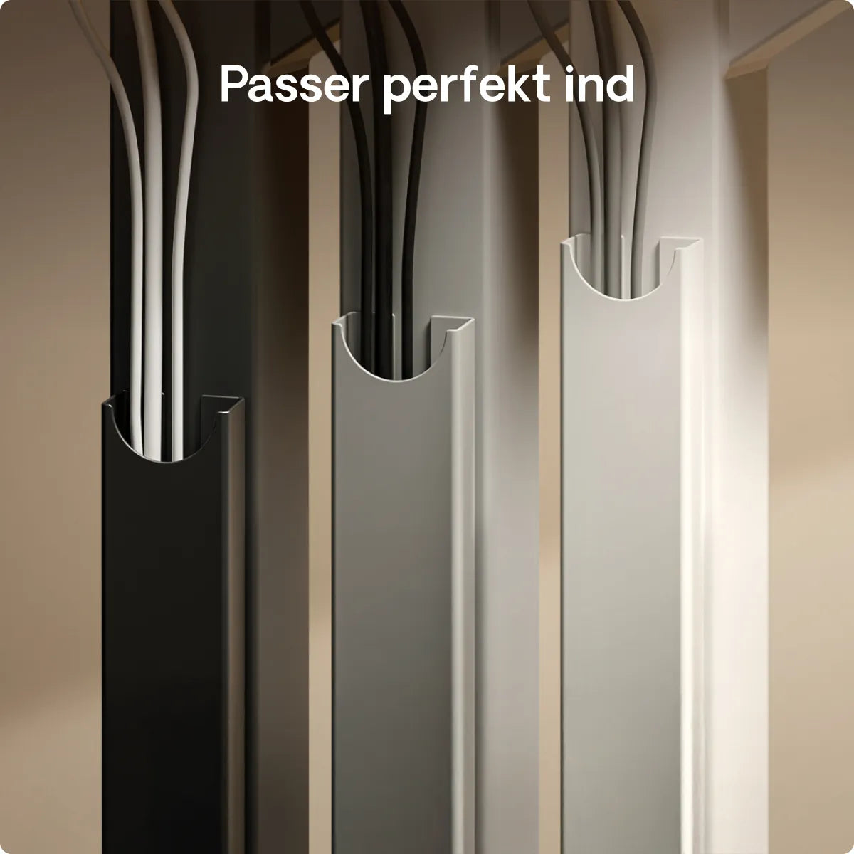 Den Magnetiske Kabelkanal kommer i samme farver som vores hæve-sænke bord rammer for et sømløst match: Sort (RAL9005), Hvid (RAL9016), og Grå (RAL9006). Den er også tilgængelig som Limited Edition farver - Dæmpet rosa (Pantone 7612 U), Olivengrøn (Pantone 4227 C), og midnatsblå (Pantone 2379 C).